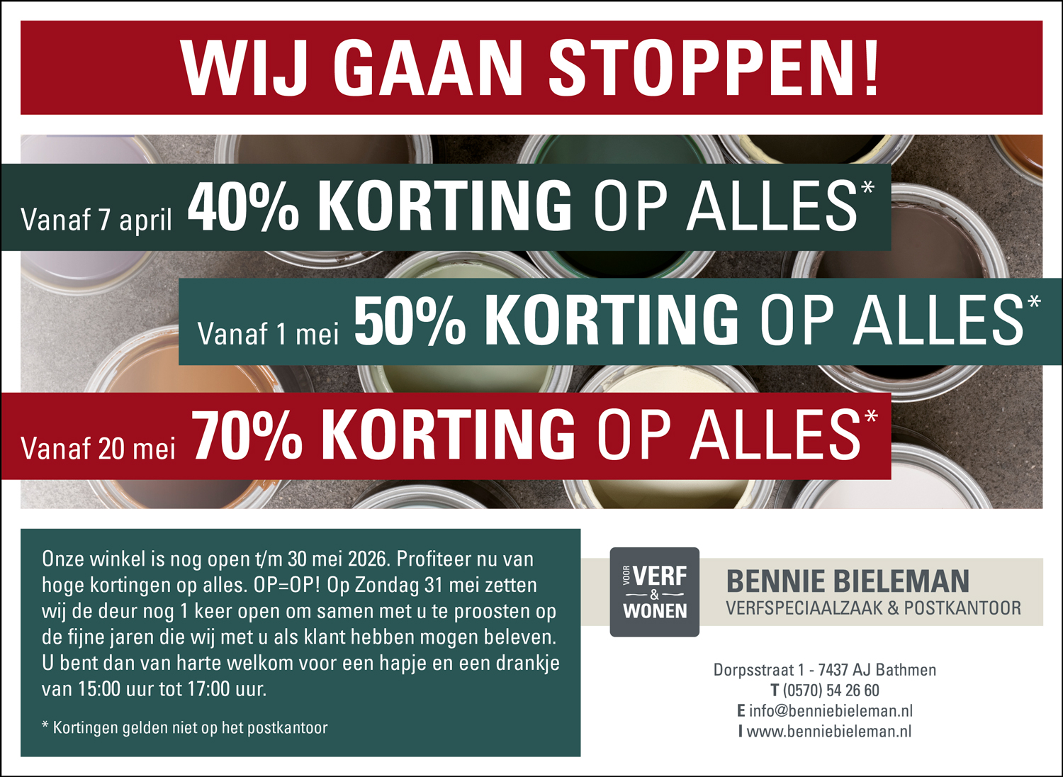 De winkel Bennie Bieleman Verf & Behang en het Postkantoor blijven gewoon open!!